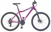 Женский горный велосипед с 27.5" колёсами и гидравлическими дисковыми тормозами от чешской фирмы Author. Любительский спортивный снаряд для грунтовок, асфальта и бездорожья. Рама из лёгкого алюминия марки 6061, качественная трансмиссия с 21 скоростью и удобными манетками, передняя звезда закрыта пластиковым кожухом и не пачкает одежду, пружинно-масляная вилка поглощает удары и улучшает сцепление.